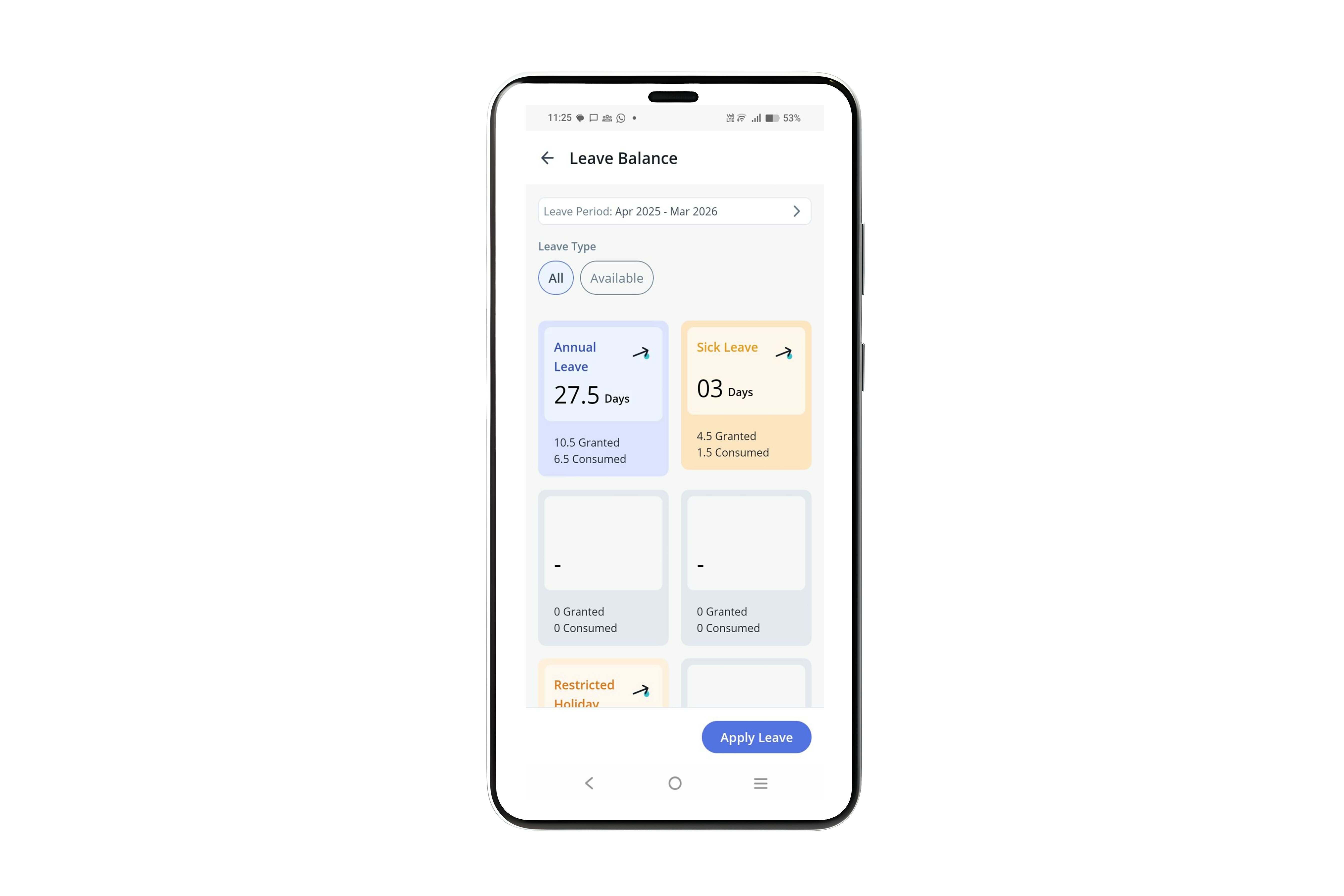The Leave Balance screen displays your total allocated leave, the number of days availed, and your remaining balance for a selected year. You can also view detailed information and apply for leave directly from this screen.