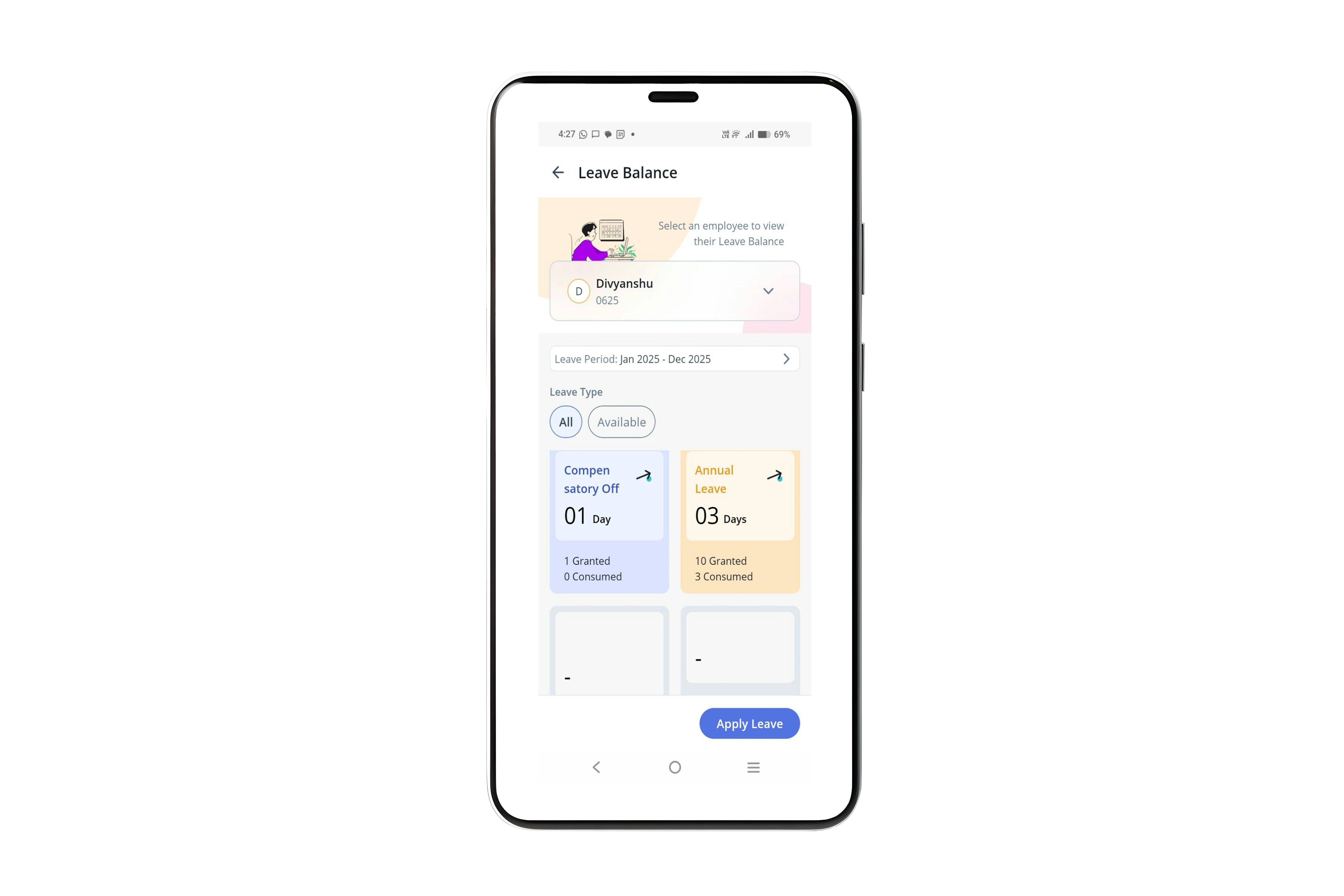 Tap Apply if you want to apply on behalf of the employee for the selected leave type.